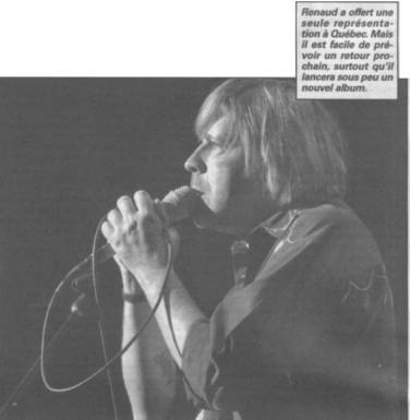 Mais qu'importe, il était beau à voir et à entendre le Renaud, même avec ses quelques kilos en trop! Débarqué au Québec la veille, il prolongera son séjour chez nous durant deux bonnes semaines, puisque le public montréalais lui réclame sans cesse des supplémentaires. Sa dernière visite chez nous remontait à 1991. Il s'était fait fort discret depuis la parution, en 1995, de son dernier album en hommage à Brassens.