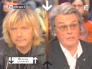 Ensuite ils sont venus s’asseoir en compagnie de Mireille Darc, Anthony Delon, et bien-sûr Alain Delon. Ce dernier ne lui a pas caché son admiration en le flattant ("grandissime, excellent renaud" je cite), qui était d’ailleurs réciproque. Renaud a avoué être un grand fan de Delon, le comparant à Brigitte Bardot, à Johnny et même au général De Gaulle! Il reste d’après Renaud une icône en France. Les films préférés de Renaud sont "Monsieur Klein" et "Rocco et ses frères". Après avoir rappelé un peu ses déboires avec l’alcool, Delon lui a dit qu’il l’avait trouvé très touchant, très pathétique lors des diverses interviews qu’il a donné à sa sortie du "tunnel".